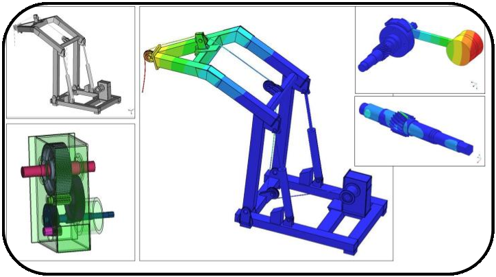 · 3D Modelling of Frame, Gear Box Items, Brake Assembly and other components. · Assembly. · Finite Element Analysis for Validation. · Life Cycle Estimation.
